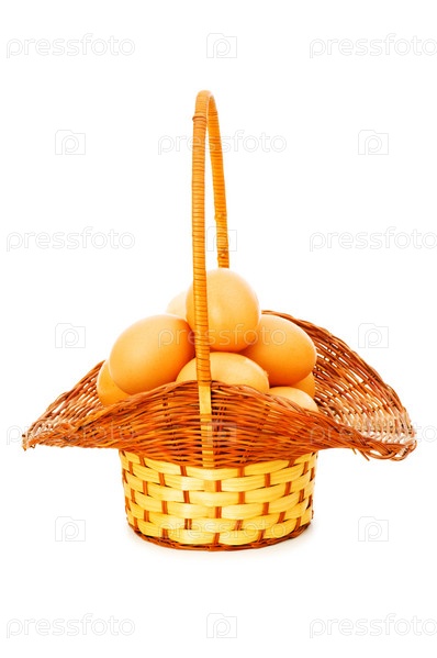 Корзина, полная яиц изолированных на белом