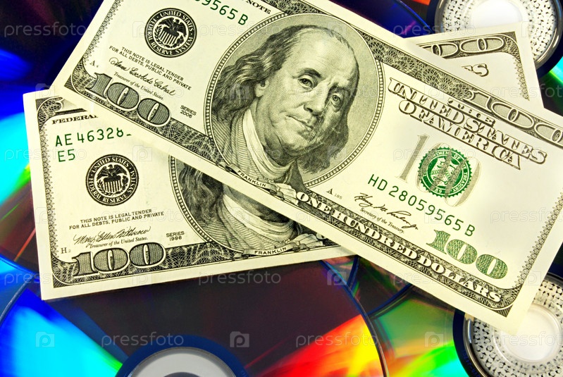 Стодолларовые купюры на фоне DVD-дисков