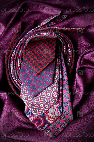 Связка разноцветных галстуков на фоне шелковой ткани