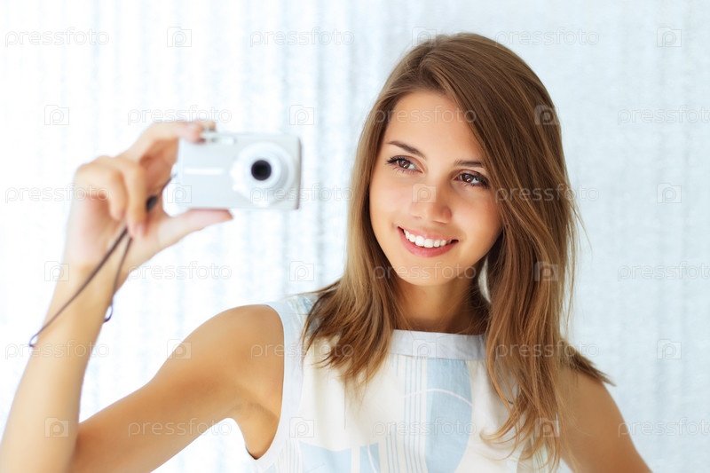 Девушка с фотоаппаратом на светлом фоне