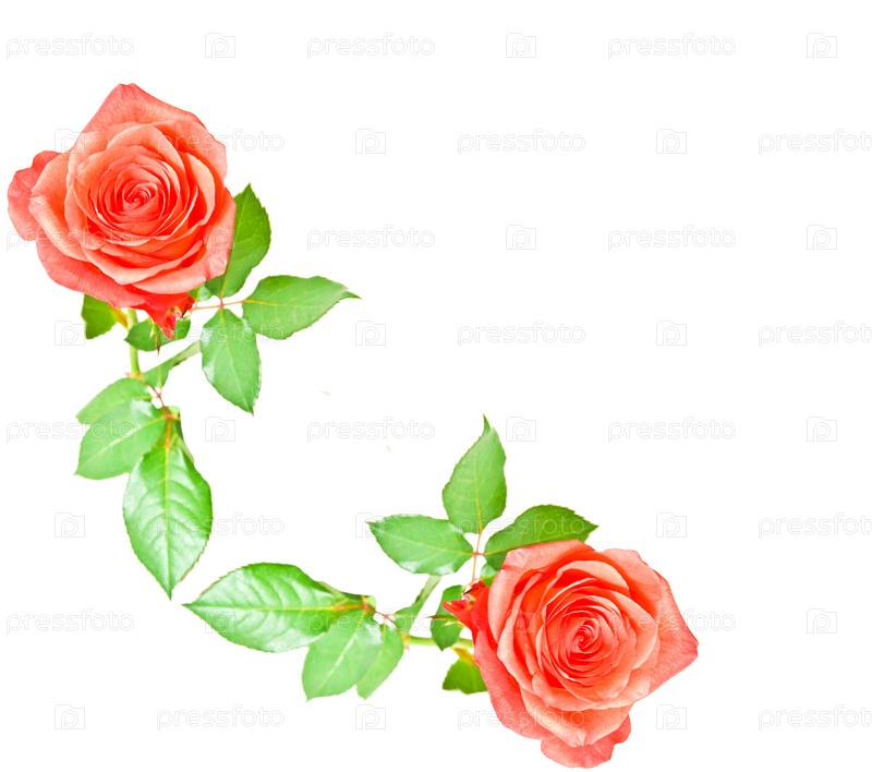 Две красные розы с зелеными листьями на белом фоне
