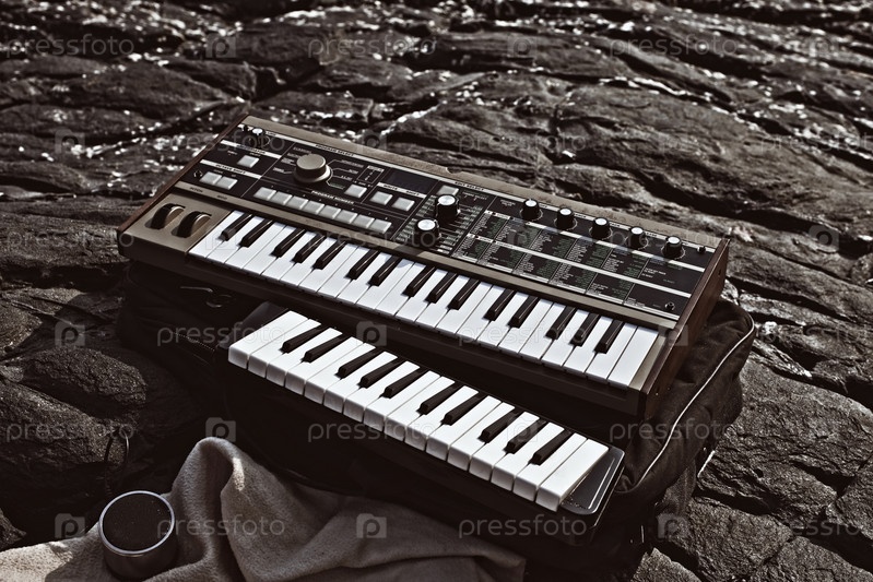 Синтезатор лежит на скалах крупным планом