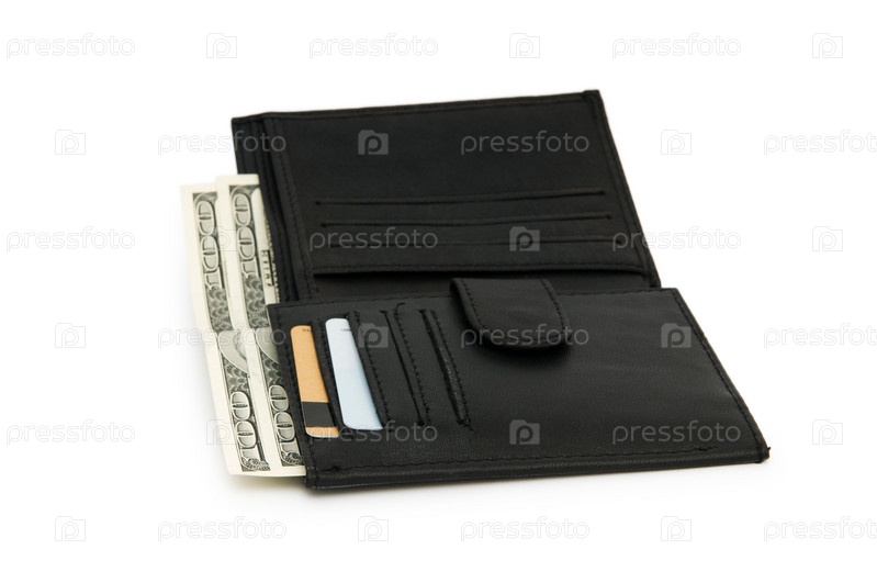 Черный кошелек с деньгами на белом фоне