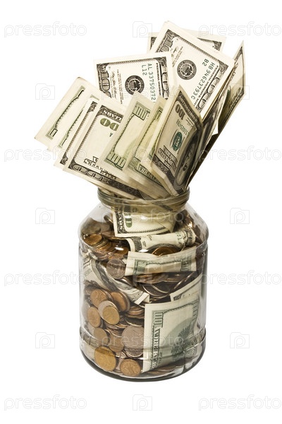 Доллары и монеты в стеклянной банке, изолированной на белом фоне