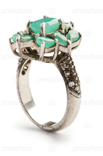 Серебряное кольцо с зелеными камнями на белом фоне