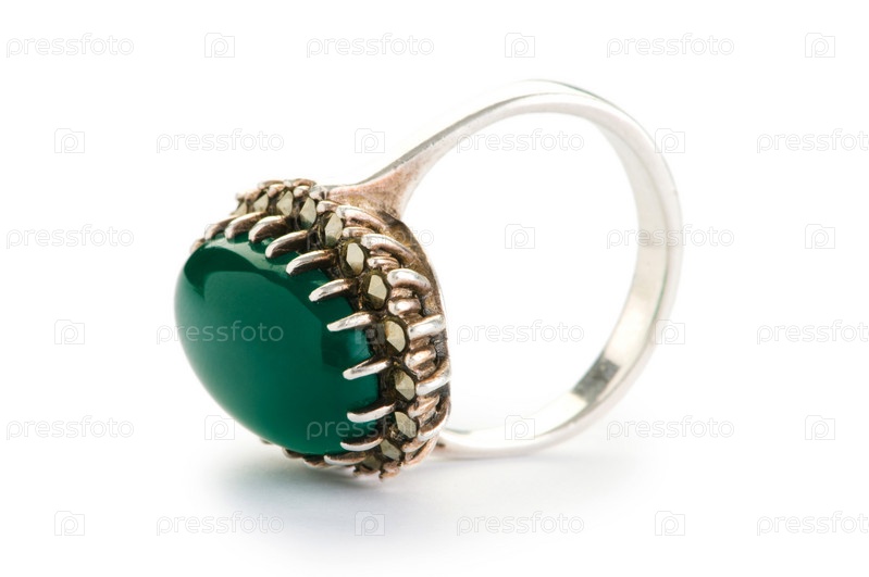 Серебряное кольцо с зеленым камнем на белом фоне