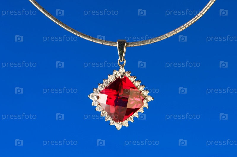 Кулон с красным камнем на голубом фоне