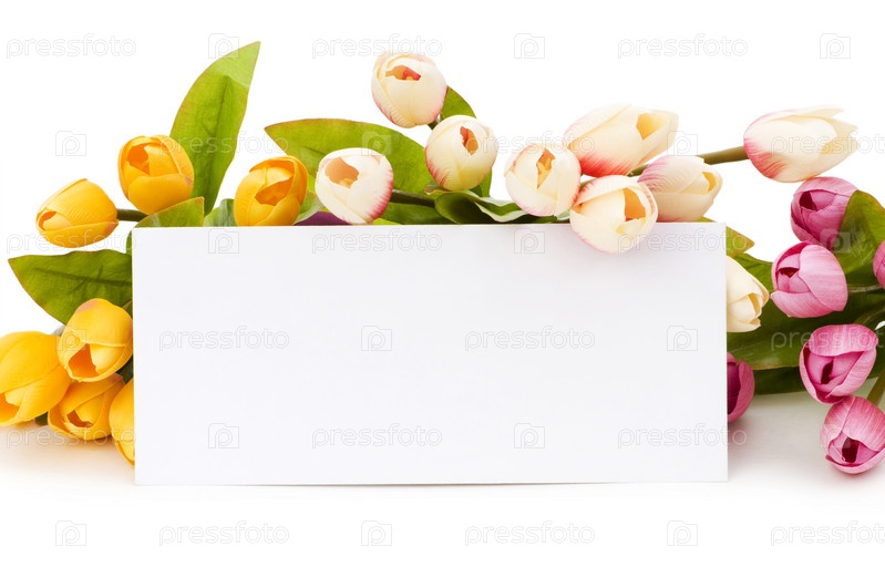 Тюльпаны и пустой лист на белом фоне