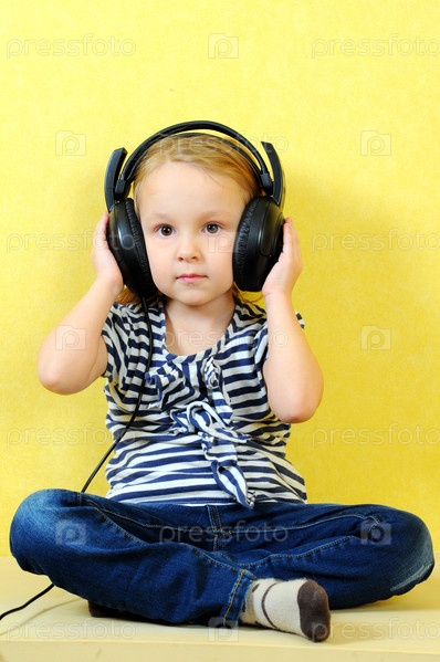 Милая маленькая девочка наслаждается музыкой, используя наушники