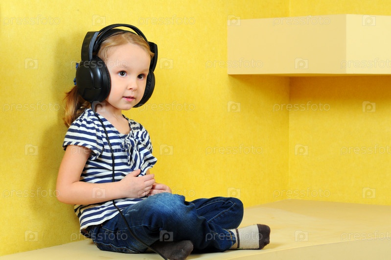 Милая маленькая девочка наслаждается музыкой, используя наушники