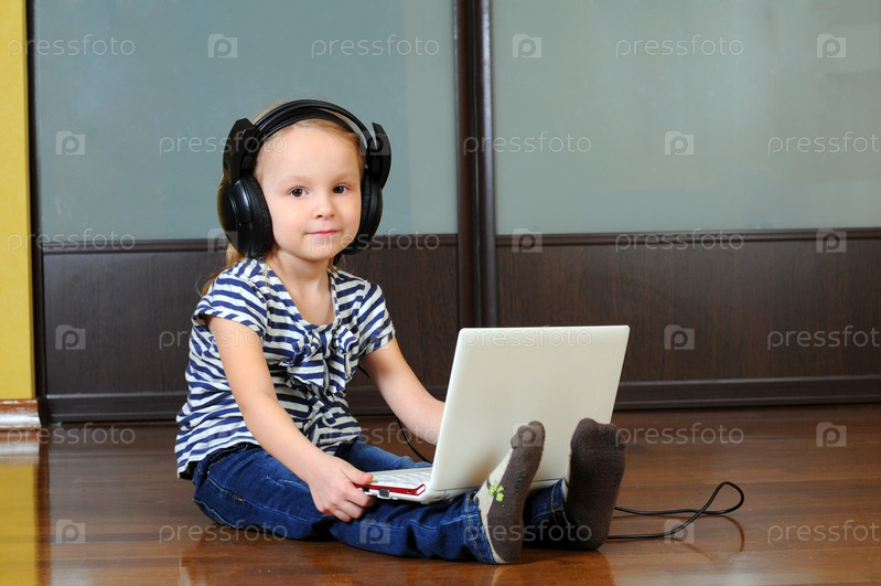 Девочка в наушниках с ноутбуком