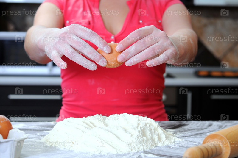 Молодая женщина месит тесто руками
