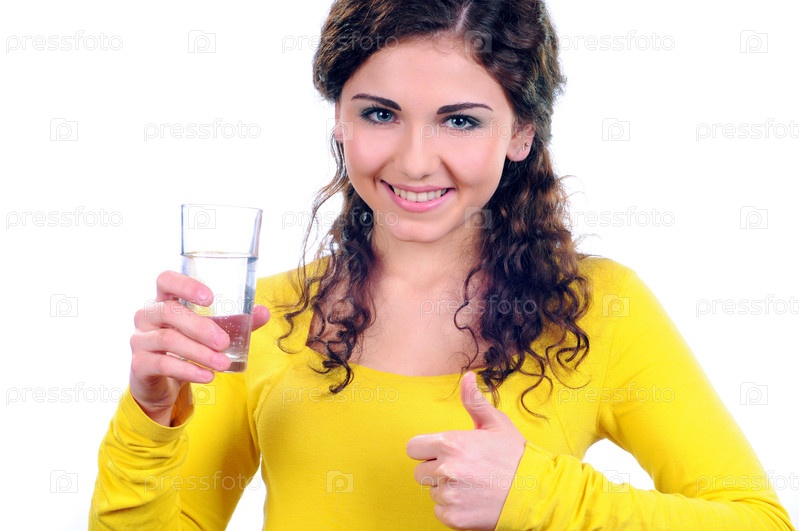 Портрет привлекательной улыбающейся женщины со стаканом воды, изолированной на белом