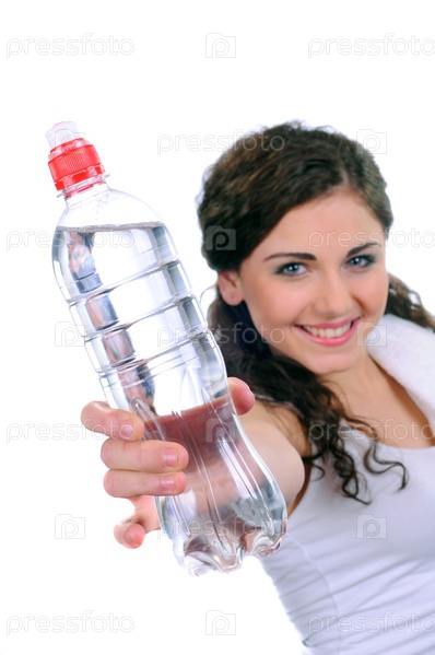 Женщина, держащая бутылку с водой на белом фоне