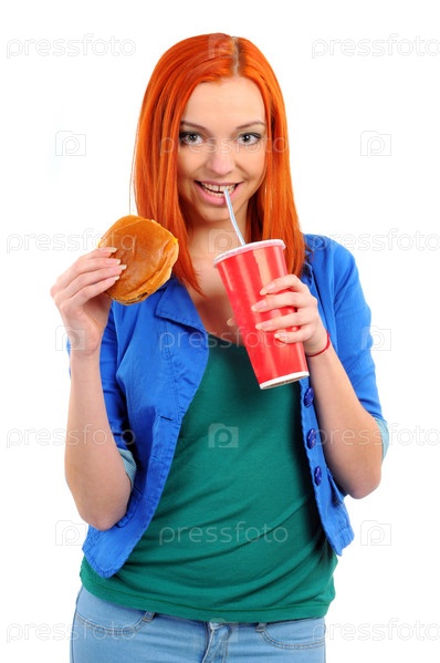 Женщина ест фастфуд. Изолировано