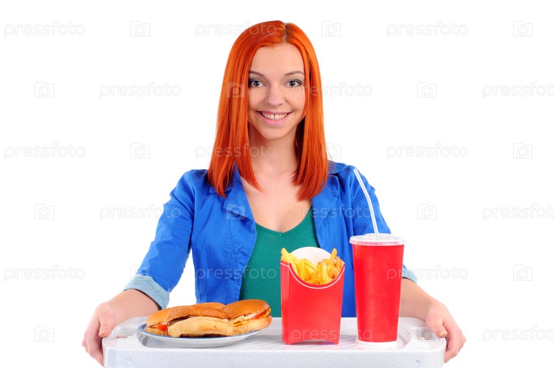 Женщина ест фастфуд. Изолировано