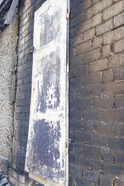 Старая обгоревшая железная дверь на фоне кирпичной стены