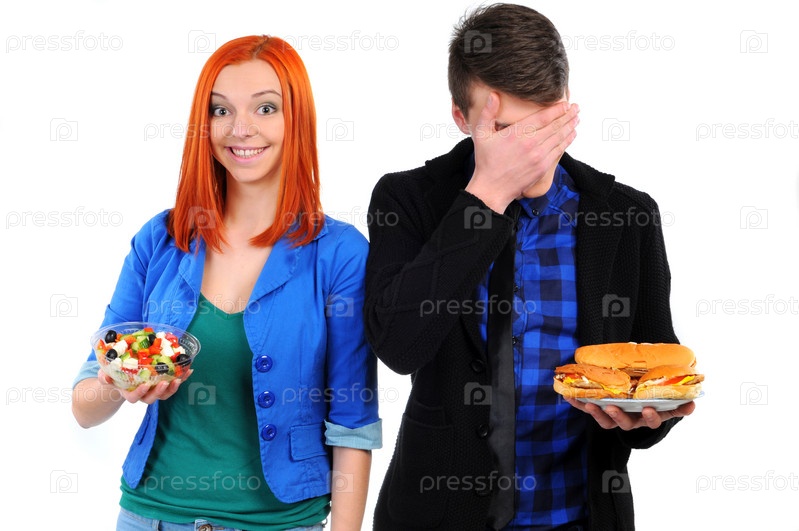 Молодые люди едят гамбургеры и салат