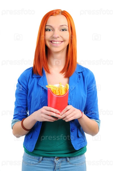 Хорошенькая молодая женщина ест картофель фри