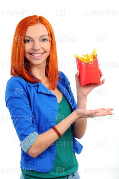 Хорошенькая молодая женщина ест картофель фри