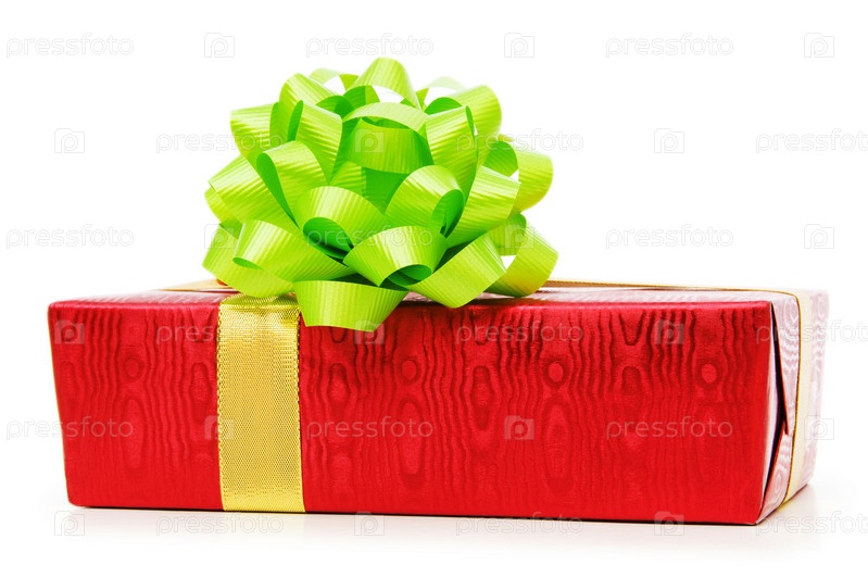 Подарок в красной упаковке с зеленым бантом на белом фоне