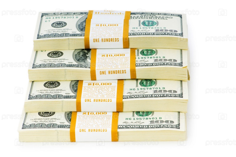 Четыре пачки долларов на белом фоне