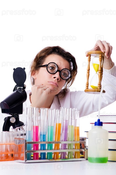 Сумасшедшая женщина-химик в лаборатории