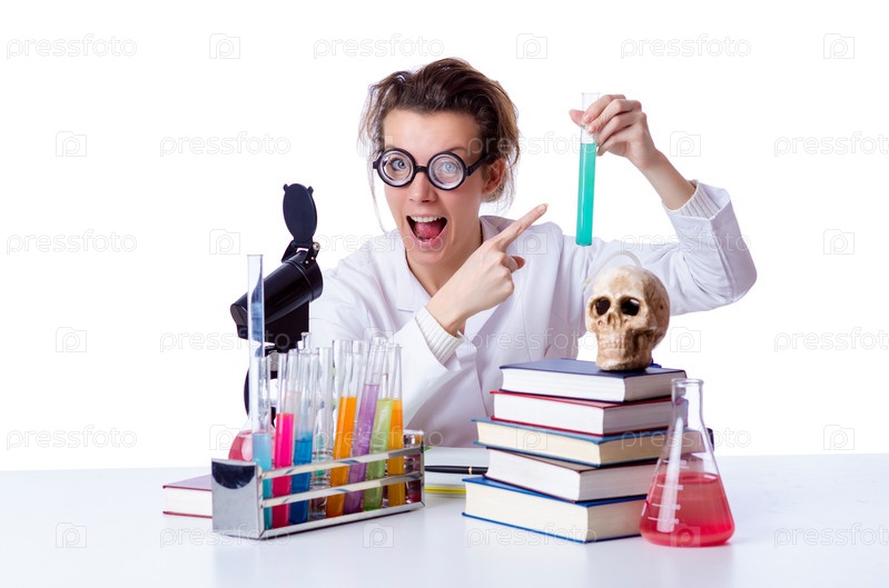 Сумасшедшая женщина-химик в лаборатории