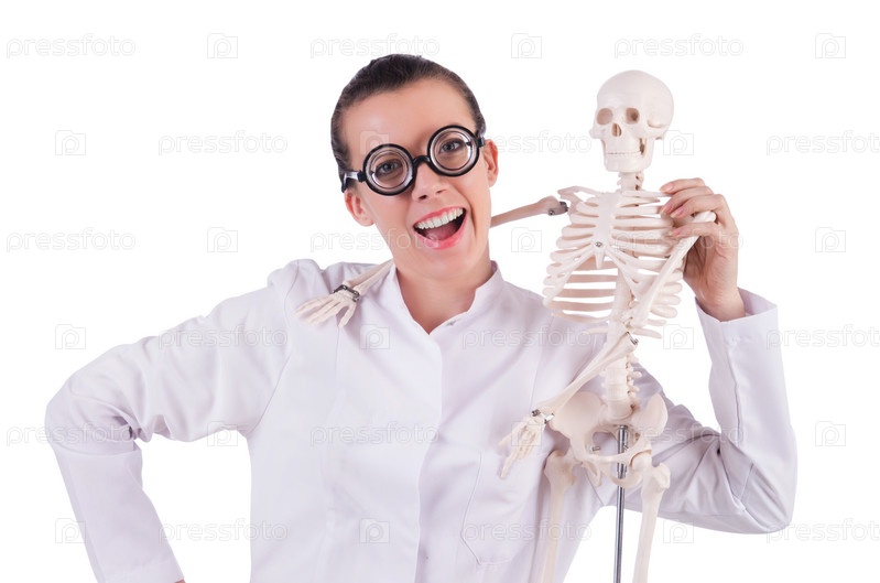 Доктор со скелетом на белом фоне