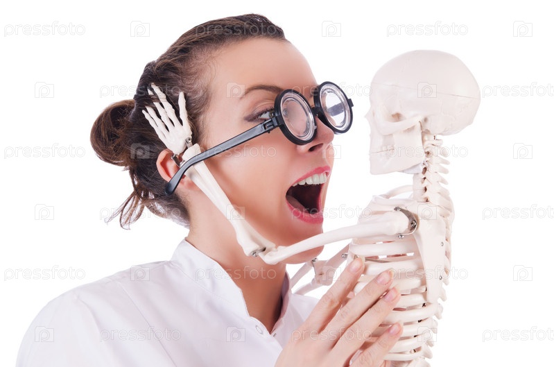 Доктор со скелетом на белом фоне