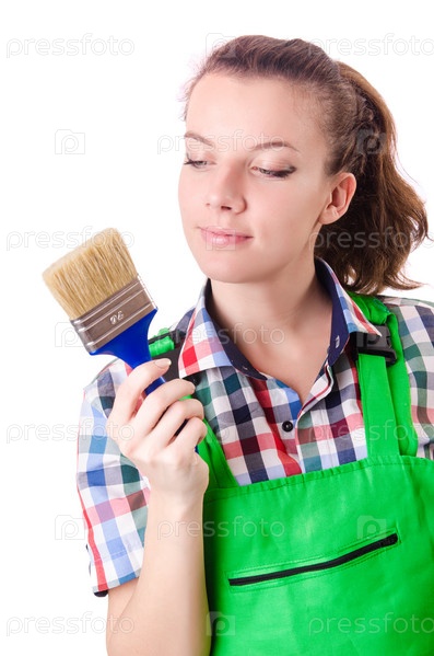 Маляр с кистью на белом фоне