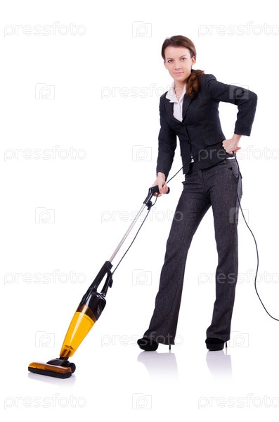 Молодая женщина с пылесосом на белом фоне