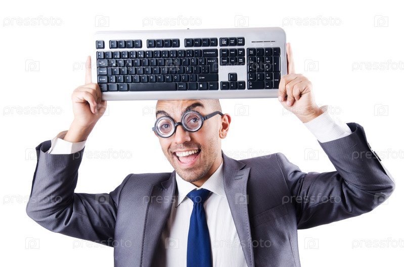 Смешной ботаник с клавиатурой на белом фоне