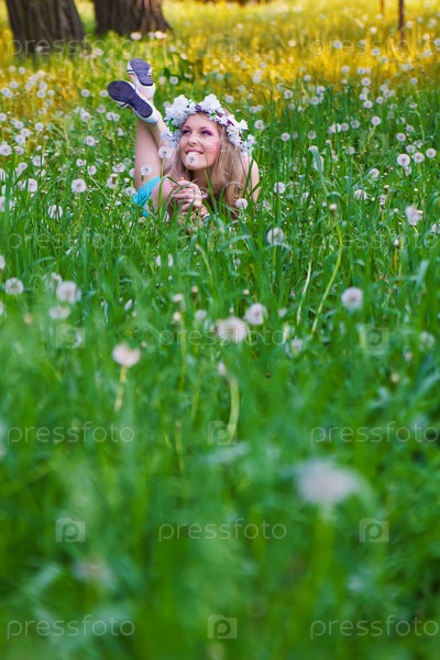 Молодая женщина дует на одуванчик на поле