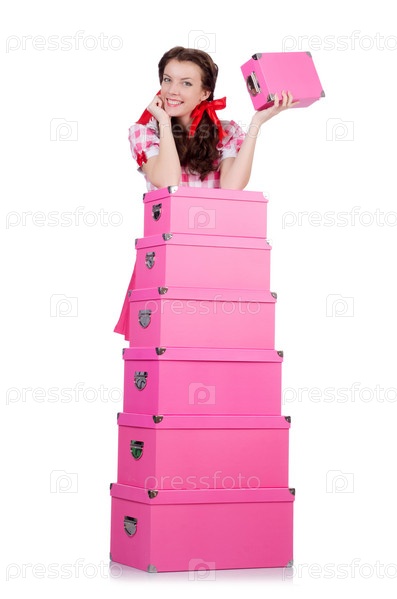 Молодая женщина с коробками для хранения на белом фоне