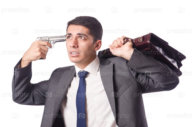 Бизнесмен думает о самоубийстве на белом фоне