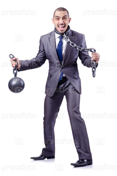 Бизнесмен с кандалами на белом фоне