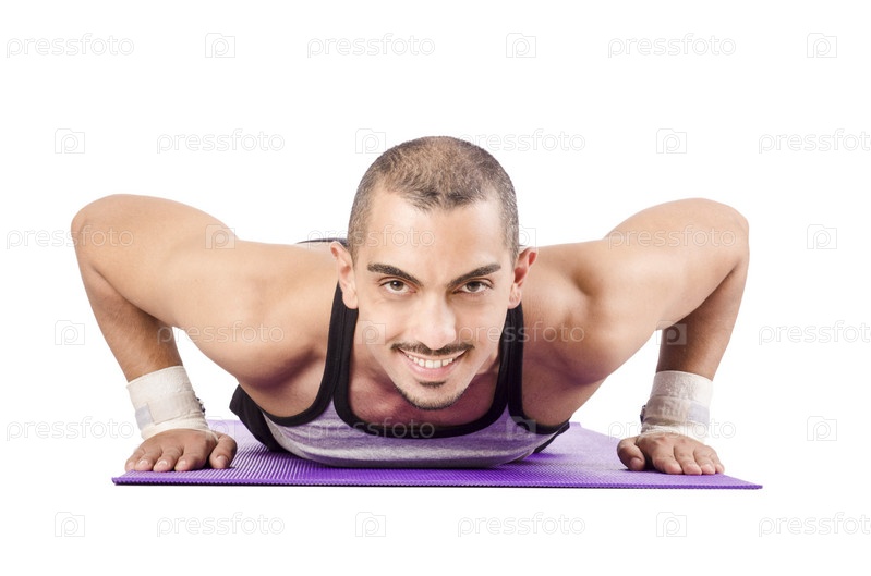 Мужчина делает упражнения на белом фоне