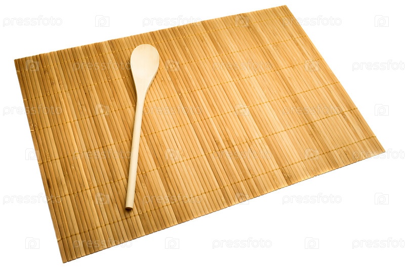 Деревянная ложкам на коврике из бамбука, изолированного на белом