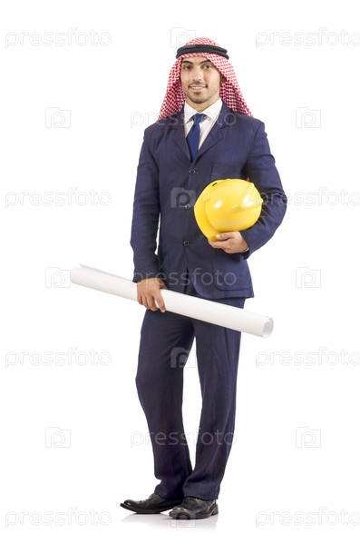Арабский инженер с рисунками на белом фоне
