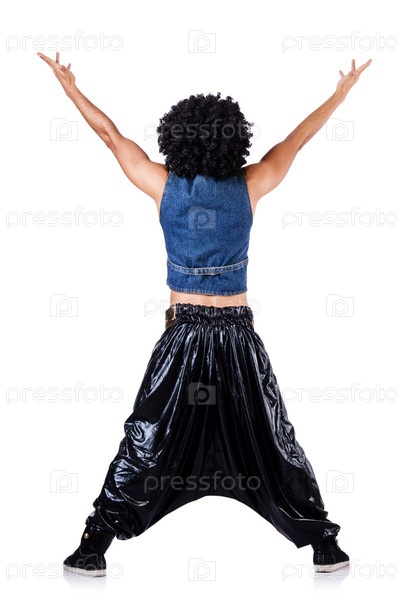 Танцор в стиле рэп в широких штанах на белом фоне