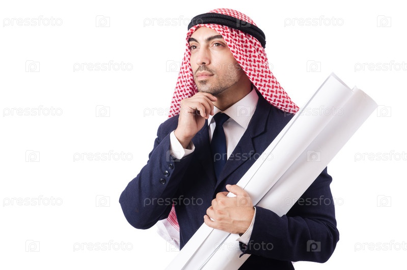 Арабский инженер с рисунками на белом фоне