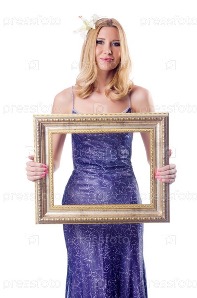 Женщина с фоторамкой на белом фоне