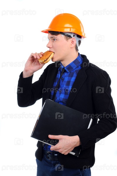 Молодой мужчина в каске ест гамбургер