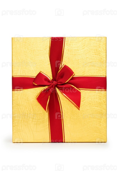 Подарок в золотой коробке на белом фоне