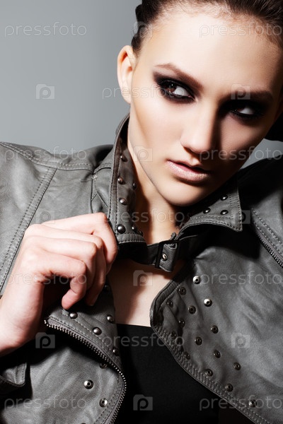 Портрет стильной девушки на сером фоне