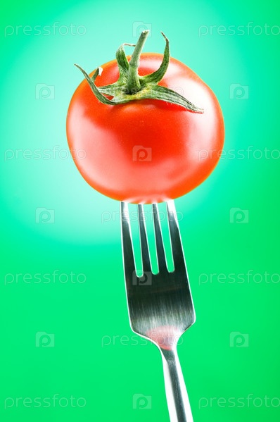 Спелый помидор на вилке крупным планом