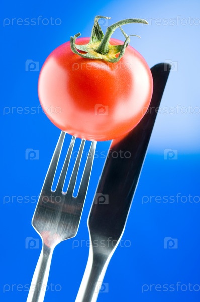 Помидор на вилке на синем фоне
