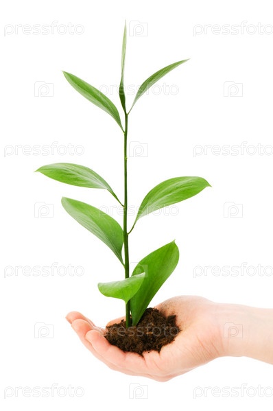 Зеленый саженец в руке на белом фоне