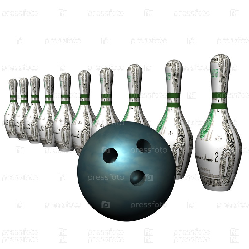 Долларовые кегли и цветной мяч для боулинга на белом фоне